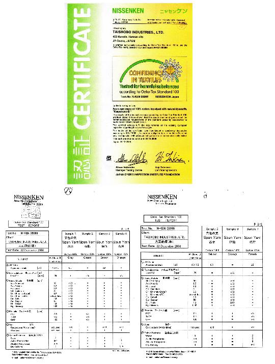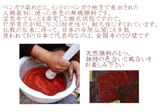 | 古色の美 http://www.kosyokunobi.com | ![]() | べんがら染は、国際規格 ”エコテックス”認証製品です。 エコテックスは、繊維製品の ホルマリン、重金属、発がん性、 アレルギー誘発性を伴う 有害物質などを規制する 国際基準で、人体に有害な 薬品を使っていない、 健康に影響を与えない等の 安全性を保障するものです |
